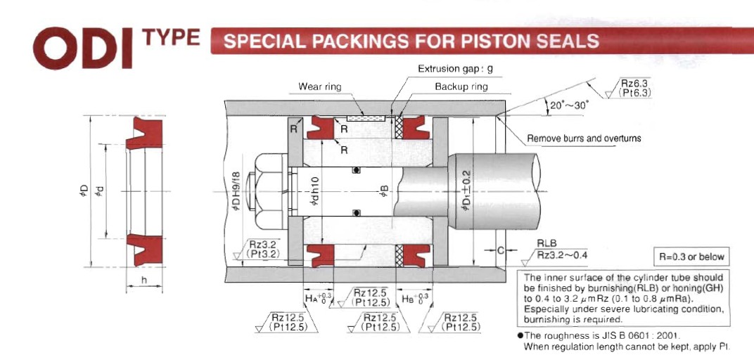 ODI型孔用密封主要材料是邵爾94度聚氨酯,壓力可達(dá)到70MPA,溫度:-35度---+100度,有極好的耐磨性和密封能力。他有較大的截面,可用于大的壓力范圍。